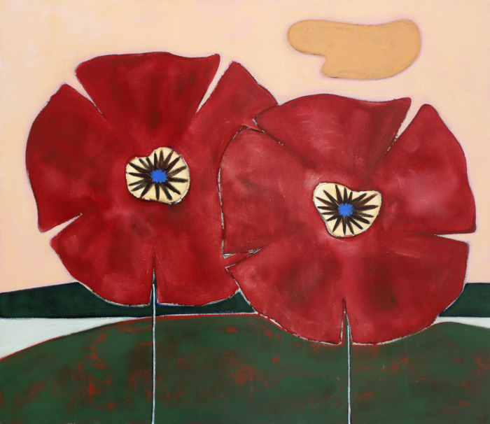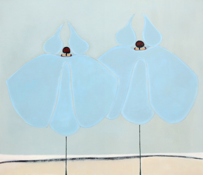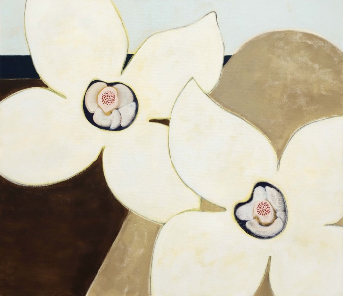 These newer works carry Kamijo’s idiom: biomorphic clusters, flat planes edged with line, thin-lipped horizons. They recall the botanicals of ukiyo-e prints, now with a newfound gravity. Indigo flesh. A sweetheart neckline. Pistils press forward. The flowers, long an emblem of fleeting existence, are open, dramatized, full of weight.